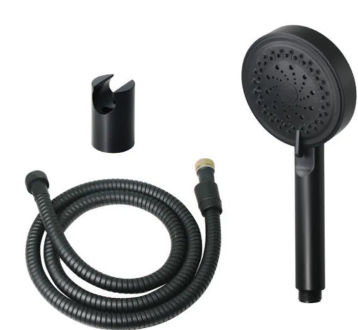 ערכת רחצה הכוללת: מזלף שחור מט עם 3 מצבי זרימה, צינור שרשורי שחור ומתלה קבוע בשחור מט
