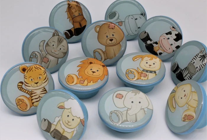 ידיות כפתור עגולות עם איורים מתוקים של חיות – אריה, פיל, דובון, חתלתול, כלבלב, פרה, זברה, ארנבון, היפופוטם, נמר, סוס וכבשונת. כל חיה מאוירת בסגנון ילדותי ונעים, עם פרטים קטנים מצוירים שמוסיפים חן וקריצה. הידיות מיוצרות בצורה שמבליטה את הציורים והברק העדין שלהן, ויוצרות יחד מראה חינני, שמח ומושלם לריהוט בחדרי ילדים.