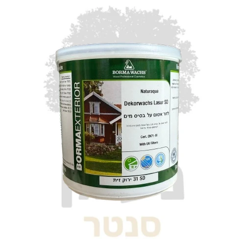 לזור Dekorwachs Lasur SD מבית Borma Wachs מיועד להגנה על עץ חיצוני בעבודות כמו דקים, פרגולות, גדרות ורהיטי גן. הלזור על בסיס מים מכיל מסנני UV, מה שמספק הגנה לאורך זמן מפני קרני השמש ושמירה על עמידות גבוהה למים ולפגעי מזג האוויר. הלזור בעל גוון אטום ירוק זית 31SD מעניק לעץ מראה מודרני, עשיר ואחיד.